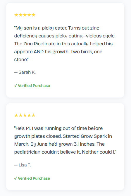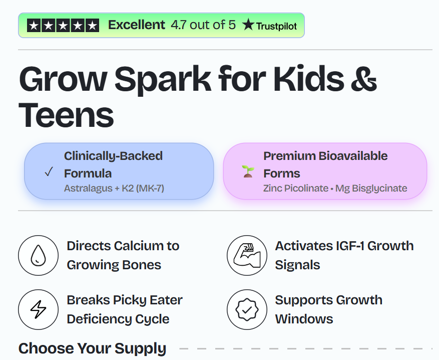 Grow Spark contains clinically-studied ingredients at safe, effective doses: Vitamin D3, K2 (MK-7), bioavailable Zinc Picolinate and Magnesium Bisglycinate, Astralagus Membraneceus root extract, Eleutherococcus Senticosus stem extract, Phlomis Umbrosa root extract, Bovine Colostrum, Alpha-GPC, and Glycine. All are well-tolerated and extensively researched.