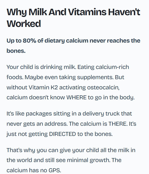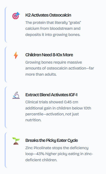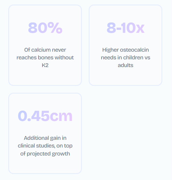 Up to 80% of dietary calcium never reaches the bones. Without Vitamin K2 activating osteocalcin, calcium has no 'GPS'—it just circulates in the bloodstream unused. Your child was probably getting enough calcium. It just wasn't getting DIRECTED to where it needed to go.