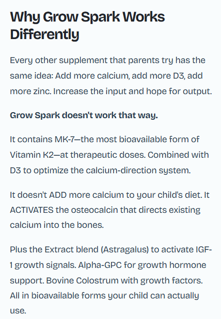 Most supplements focus on adding MORE calcium and vitamins (input). Grow Spark focuses on DIRECTING existing calcium to bones through K2-activated osteocalcin, plus activating IGF-1 growth signals through Astralagus membraneceus root extract, Eleutherococcus senticosus stem extract and Phlomis umbrosa root extract.